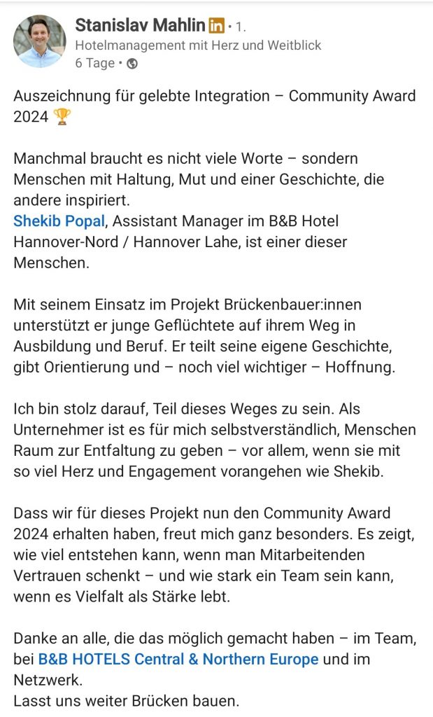 Auszeichnung mit dem Community Award der B&B Hotelkette: